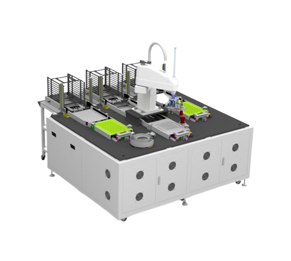 设备名称:视觉定位自动摆盘设备 应用领域:半导体,电子产品 应用简介: 视觉识别产品,与MES交互 机械手移动相机拍照 多个视觉定位,精度高 设备特点: 精度高,稳定性好 速度快,行业要求高 上位机集中控制,多模块合作交互 MES系统实时交互